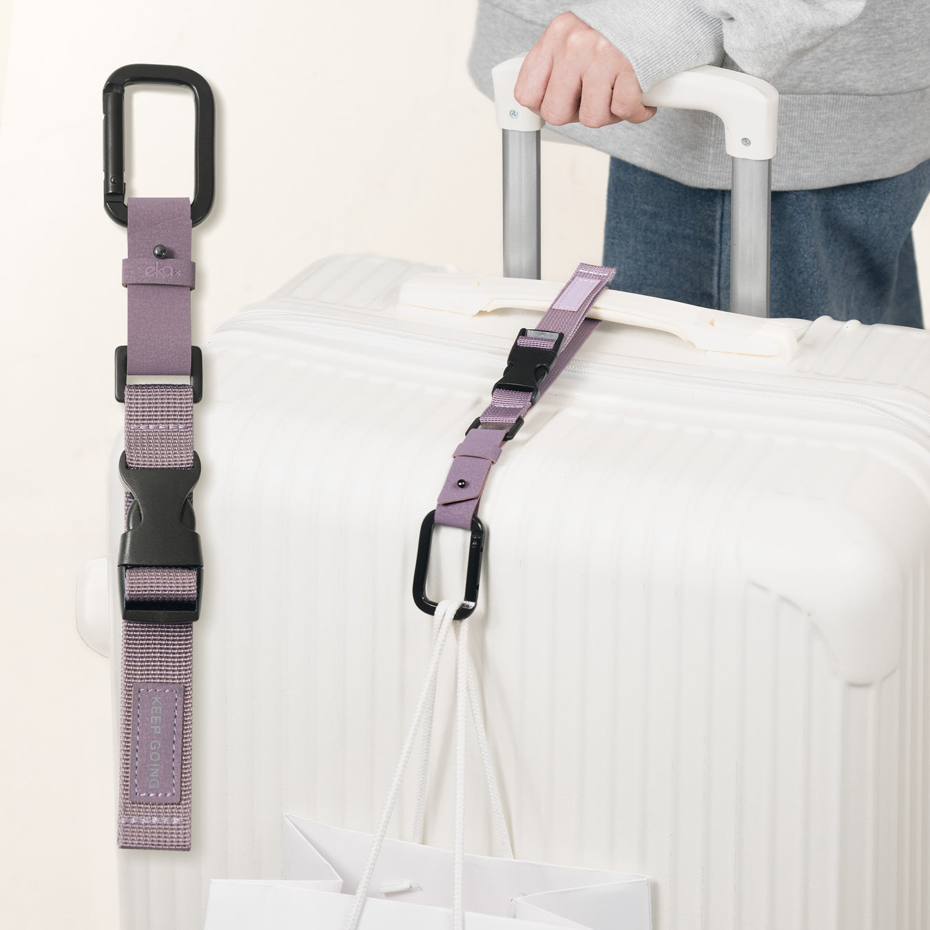 Our luggage strap is is designed to be portable and convenient to have! You can carry it on shopping cart, baby stroller, or put it on your purse as simple bag accessory to increase storage space and let your hands-free on the go.